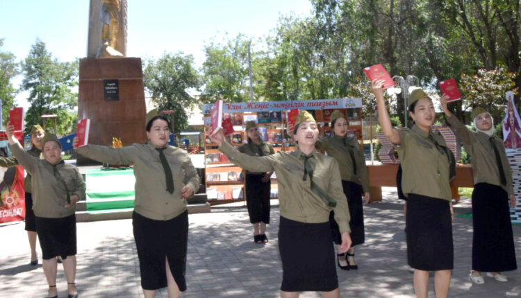 Шара шымылдығы кітапхана қызметкерлерінің орындауындағы әнмен ашылды. Одан соң жүргізушілер ананы баласынан, ағаны бауырынан айырып, мыңдаған боздақтарды жер жастандырып, бөтен елдің топырағын бұйыртқан зұлмат соғыстың өлшемі адам өмірімен, тағдырымен бағаланып, өте қымбатқа түскен Жеңістің тарихы жайлы мағлұмат берілді. Кітапханашылар Тұрсынай Тұрғынбай мен Алтынай Орманова шығыстың қос жұлдызы — Әлия Молдағұлова мен Мәншүк Мәметованың ерліктері туралы шағын көрініс көрсетті. Әрмен қарай еліміздің бостандығы мен бақытты өміріміз үшін жаумен шайқасқан қазақстандық Кеңес Одағының Батырлары, соның ішінде ерліктің өшпес ерлігін көрсеткен жерлесіміз, даңқты батыр Ақәділ Суханбаев туралы кеңінен ақпарат берілді.