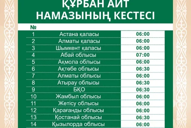 — 6 маусым – Құрбан айт мейрамының алғашқы күні. Осы күні оқылатын Құрбан айт намазының еліміз бойынша әзірленген кестесін назарларыңызға ұсынамыз, — делінген хабарламада.