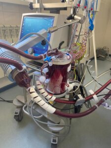 Жүргізілген қарқынды терапияға қарамастан, науқастың жағдайы біртіндеп нашарлай берді. Торакотомия арқылы хирургиялық емдеу туралы шешім қабылданды. Операциядан кейінгі кезеңде тыныс алу жеткіліксіздігіне байланысты науқастың жағдайы өте ауыр болды. Ол өздігінен демала алмады, тек өкпені жасанды желдету аппаратымен ғана интубациялық түтік арқылы тыныс алды. Күні бойы теріс динамика байқалды – гемодинамиканың тұрақсыздығы және гипотония байқалды, қан қысымы 80/40 мм-ге дейін төмендеп кетті. Пульмонолог дәрігердің қарауынан кейін фибробронхоскопия жасалды. Нәтижесінде трахея мен бронхтарда көп мөлшерде қызыл көбікті қан анықталды, сондықтан қан кету көзін анықтау мүмкін болмады. Мультидисциплинарлық консилиумның шешімімен тыныс алу терапиясын жүргізумен түзелмейтін, өкпені оттегімен қанықтыратын және желдету функцияларының бұзылуымен қатар жүретін өкпе газ алмасуының өмірге қауіп төндіретін өрескел бұзылуларын ескере отырып, науқасты шұғыл тамыр-веноздық экстракорпоралды мембраналық оксигенацияға қосу көрсетілді.